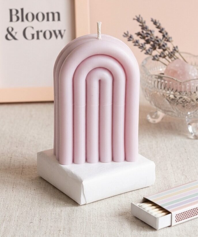 This stunning, unscented candle features a unique ribbed, layered arch design that draws inspiration from timeless modern architecture and the playful shape of a rainbow. Its shape creates a captivating interplay of shadow and light even before it’s lit, making it a sophisticated addition to any bookshelf, mantlepiece, or centerpiece.