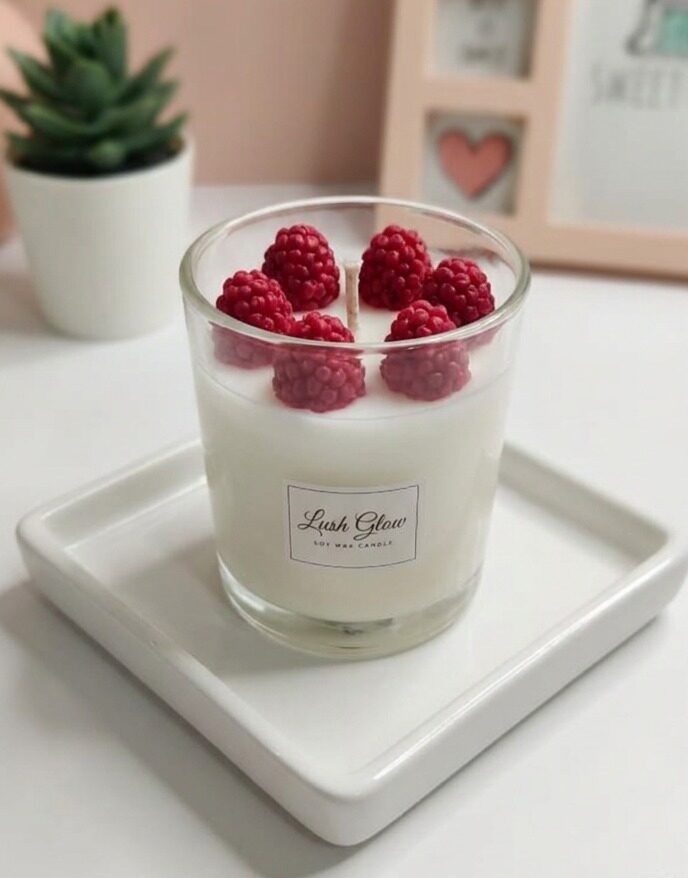 Elevate your home decor with Raspberry Radiance. This artisanal soy wax candle features a clean, white base topped with realistic, vibrant red raspberry wax embeds. Infused with a luscious, fruity fragrance, it provides a warm, inviting glow and a delightful scent profile that transforms your space into a cozy sanctuary.